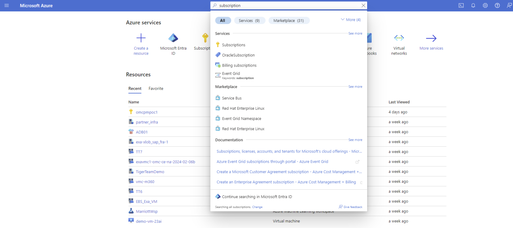 - Select Subscriptions in the search results to navigate to the Subscriptions list view. Find the subscription you want to use for onboarding in the list view.