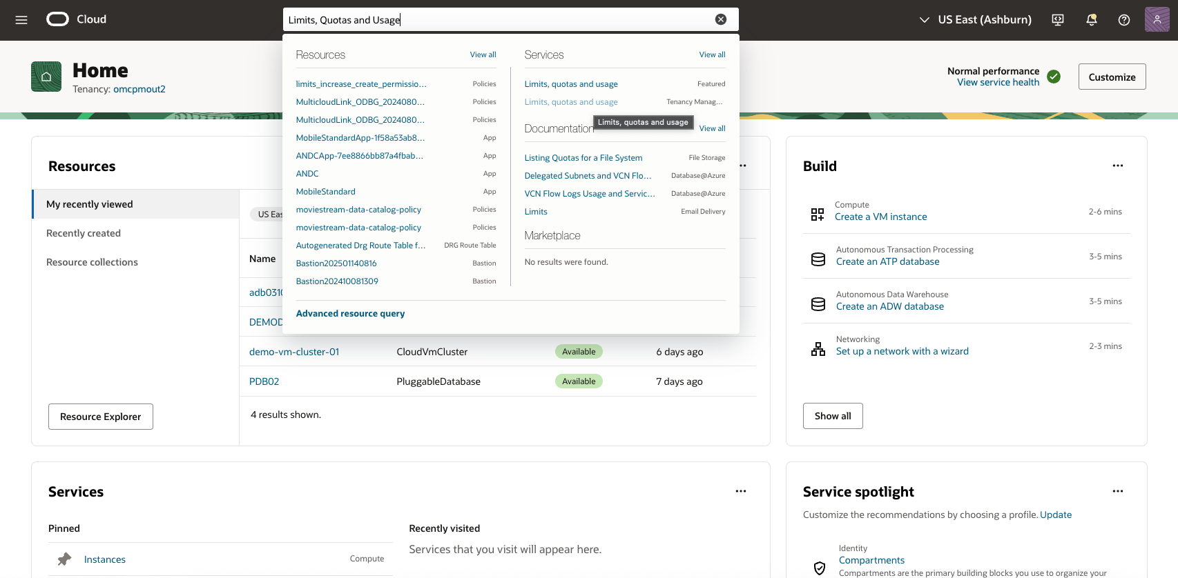 1. In the Oracle Cloud Console, search for Limits, Quotas and Usage, then select Limits, Quotas and Usage to navigate to this page in the Tenancy Management section of the Console.